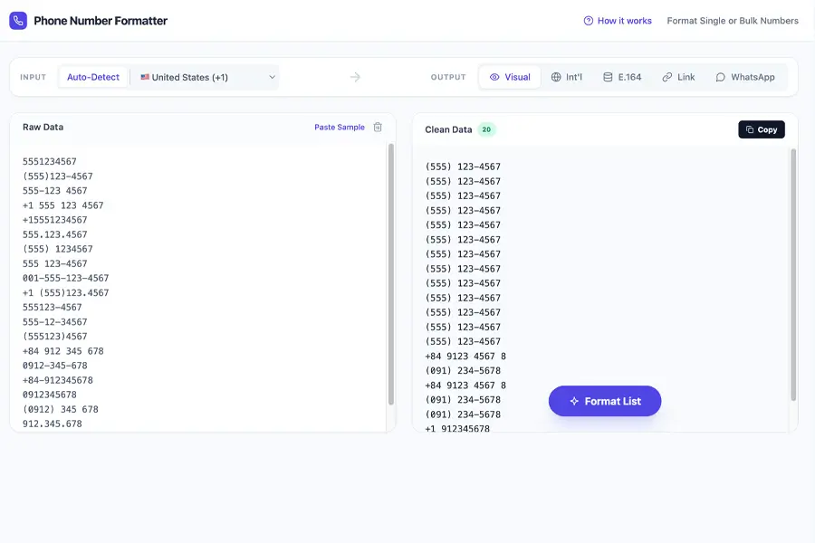 Format phone numbers into consistent, professional styles for websites, ads, or contact lists. Supports bulk formatting to save time on large lists.